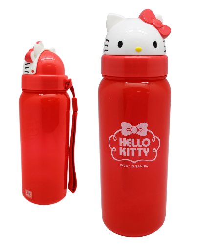 Tall Red Traveling Hello Kitty Bottle with Lanyard Lid and Straw Attached