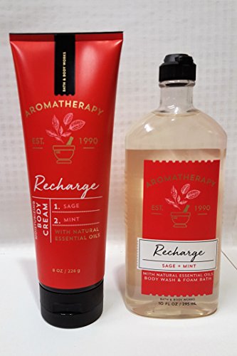 Recharge - Sage & Mint - Sage Essential Oil helps you feel refreshed and Mint Essential Oil sharpens your senses. Body Wash & Foam Bath 10oz. & Body Cream 8 ozFeature