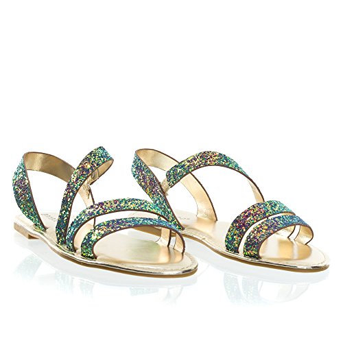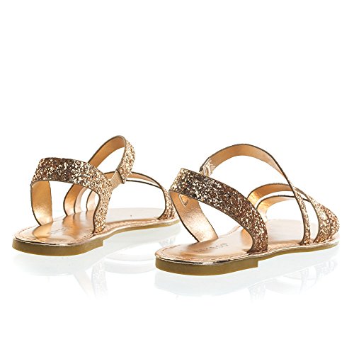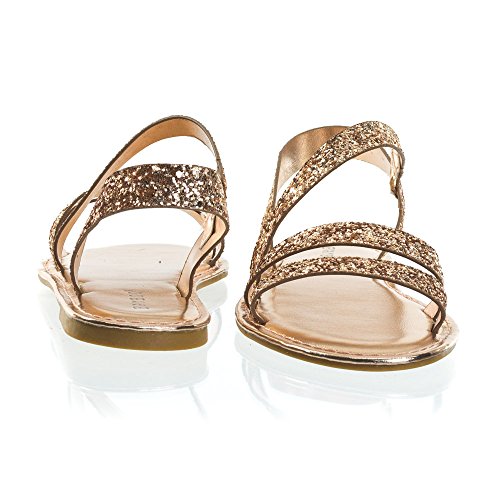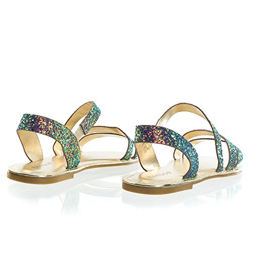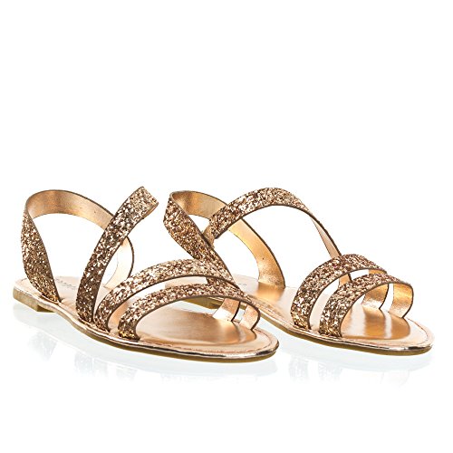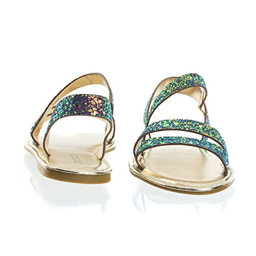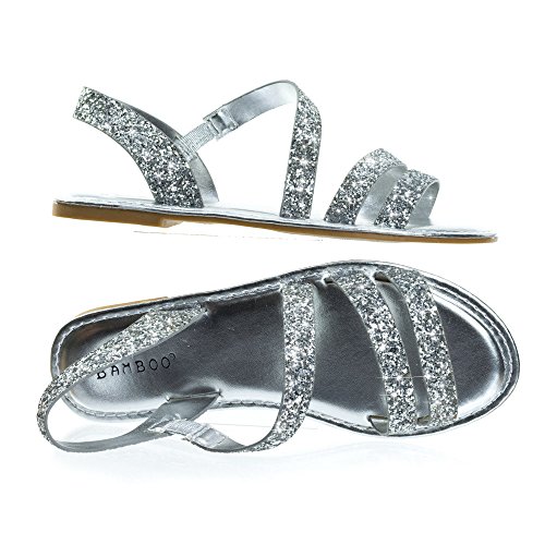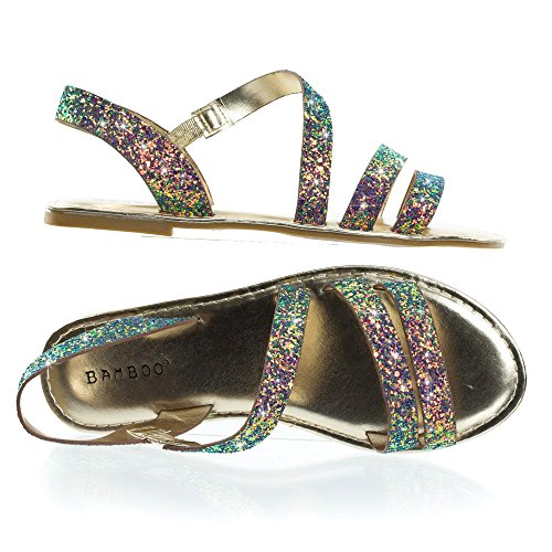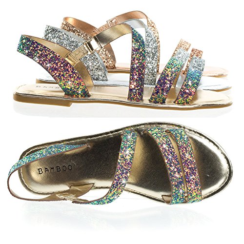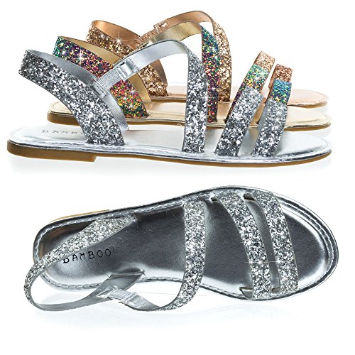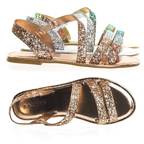 Binding : Apparel Product Description About This Shoes :These metallic flat sandal features a cage like strap closure, elastic on the side strap, sling back strap and large rock glitter. The glitters fall off easily so please handle with care. These sandal comes in solid silver glitter, solid rose gold glitter and color shifting iridescent glitter that changes from green/blue to purple blue depending on the angle you view it. Brand - Bamboo Colors Available: rose gold, silver, blue green Occasion: Casual Shoe Type: Gladiator Shoe Style: Gladiator Inner Lining: synthetic Heel Height In Inches - Heel Style - 0 Toe Style - open-toe Platform Height In Inches - Shaft Height In Inches - Circumference Opening - Strap Type - slingback Sole - manmade All Man Made Material unless otherwise stated. Computer/Phone/Table monitors might show color differently because of its quality or calibration, we suggest you look at the photo in at least 3 monitors if you need exact color match of your shoes. 0
