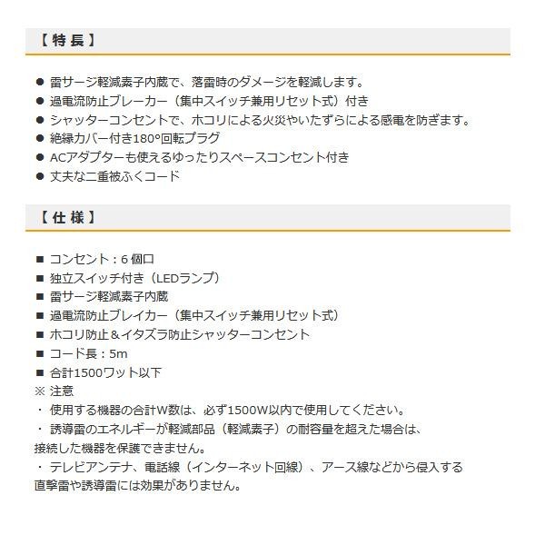 雷ガード機能がついた6個口の電源タップです。シャッターコンセント式でホコリによる火災やいたずらによる感電も防止します。