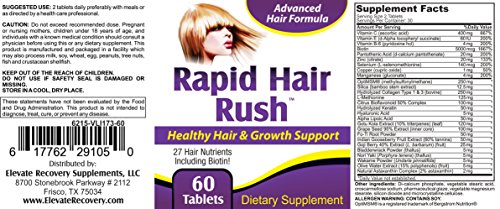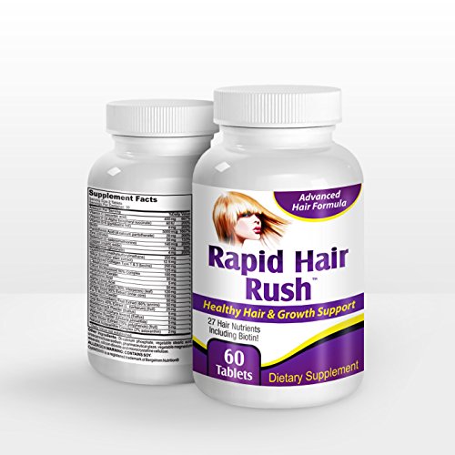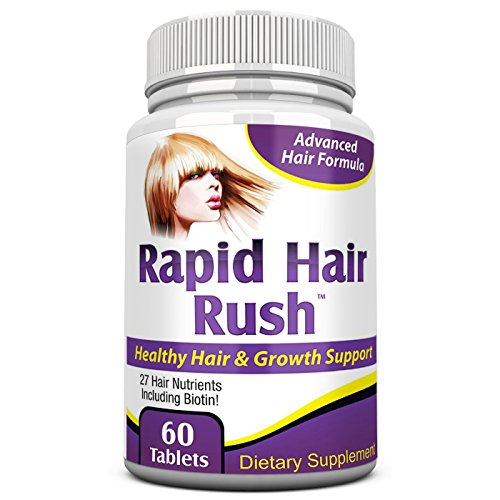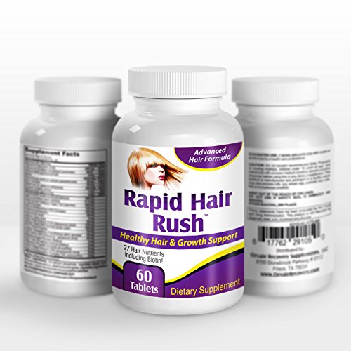 -. Feature : Loaded with 27 natural hair growth supplements including 5000 mcg Biotin - First time customers get 10% OFF 1 bottle with coupon code: 7XLFTGE7 / Quickly stimulates longer and better looking hair while reducing hair loss and thinning / Repair damaged hair due to age, chemicals, and styling habits / RAPID-HAIR-RUSH contains: Biotin (5000mcg), Vitamin A, Vitamin C, Vitamin E, Vitamin B1, Vitamin B2, Niacinamide, Vitamin B6, Folic Acid, Pantothenic Acid, Calcium, Zinc, Copper, Choline Bitartrate, Silica, Inositol, Para-aminobenzoic Acid, L-Cysteine, MSM, Ginkgo Biloba, Saw Palmetto, Pygeum Africanum, Green Tea, and Grape Seed Extract - Natural hair growth pills with vitamins/minerals/herbs / Results are guaranteed or 100% money back | Healthy Hair + Growth Support