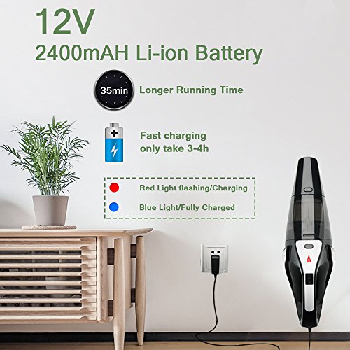 Powered by Lithium battery, LOLLDEAL handheld vacuum ensures 30mins of continuous use on a quick charge(3-4h) by an included charging adapter.