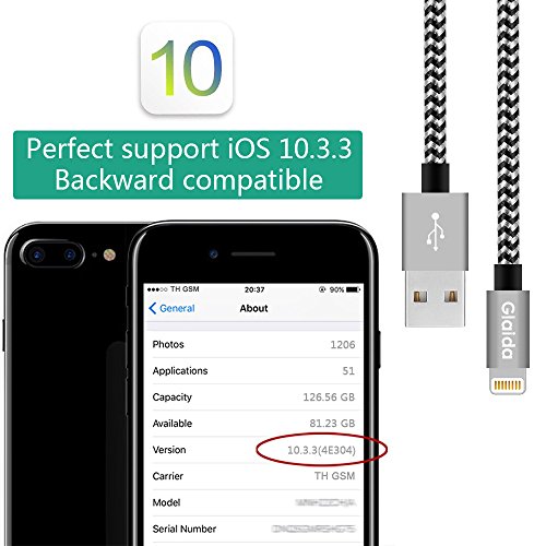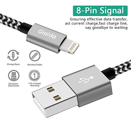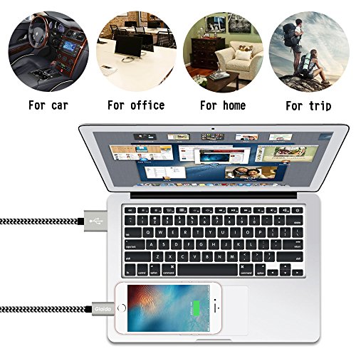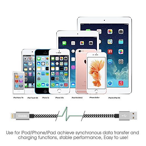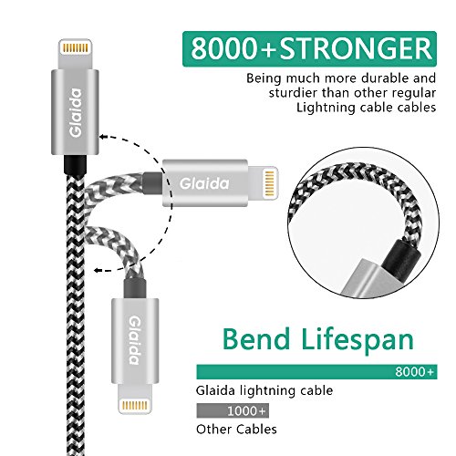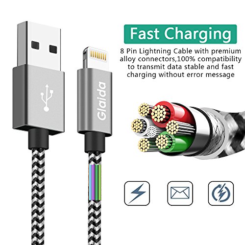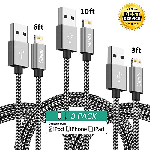 Glaida iphone charger cable 3Pcs 3ft 6ft 10ft Extra Long Nylon Braided Lightning Cable USB Charging Cord Charger for iPhone7 Plus/7/6s Plus/6s/6 Plus/6,5s/5,iPad Air/Mini More iOS Devices(Black+Gray)