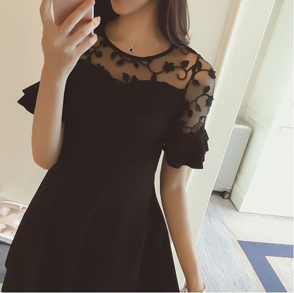 キュート二段フリルスリーブ シースルーレース 半袖 Aラインワンピース/ L
