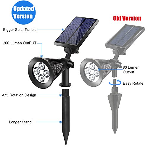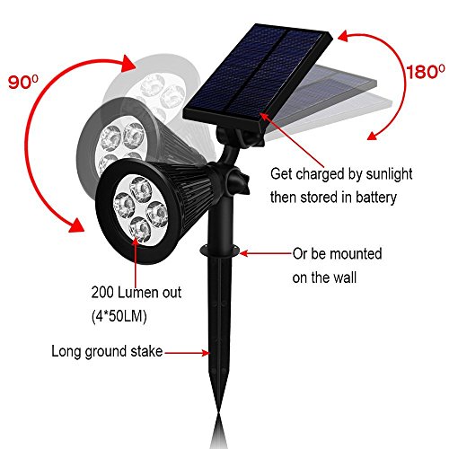 ②【2-in-1 TOOL-FREE INSTALLATION】: Stick into the ground / Use included screws to mount on the wall. 200 Lumen output, 4 x 50 Lumen enhanced LED.