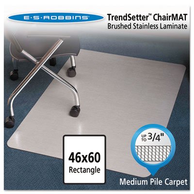 -. Binding : Office Product -. Brand : ES Robbins -. Feature : Laminate chair mat with the look of metals. / Beautiful yet tough, these mats replicate the look of metals to coordinate with accessories and furniture hardware. / All day support for everyday office use. / Protects medium pile carpets up to 3/4'' thick including padding. / Exclusive AnchorBar® chair mat cleats hold firmly in place yet are gentle on carpet and fingers. -. Label : E.S. ROBBINS -. Manufacturer : E.S. ROBBINS -. MPN : ES Robbins Products-119338 -. NumberOfItems : 1 -. PackageQuantity : 1 -. PartNumber : ES Robbins Products-119338 -. ProductGroup : Office Product -. ProductTypeName : OFFICE_PRODUCTS -. Publisher : E.S. ROBBINS -. Studio : E.S. ROBBINS -. Title : Stainless 60x46 Rectangle Chair Mat, Design Series for Carpet up to 3/4''