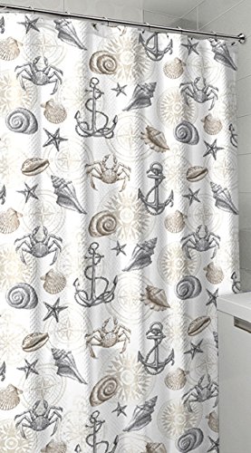- Featuring crabs, shells, sea stars, starfish, anchor, and compass, this shower curtain maintains a nautical motif in natural tones of color. It has a hand sketched style to complete the rustic look.