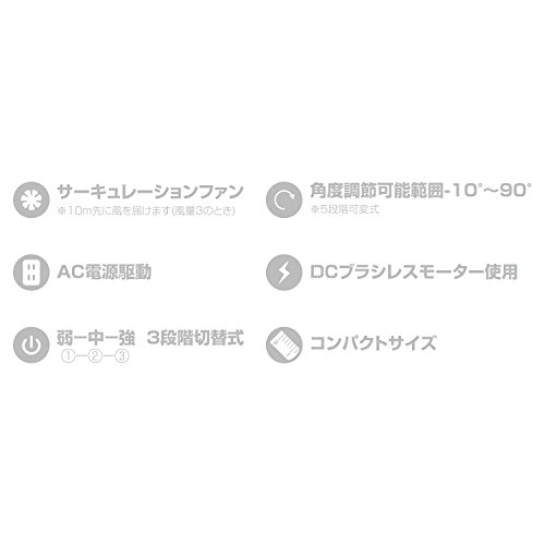●AC전원식 서큘레이션 팬입니다.풍량은 약중 남짓의 3단계 변환가.각도는 5단계 조절 가능(딴곳-10~90도).콤팩트이지만 풍량 남짓의 경우,10m처(먼저)까지 바람이 도착합니다.실내의 공기를 순환시키고, 쾌적한 온도 습도에 접근할 수 있습니다.●플라스틱 테두리●본체:높이143×폭147×(길이)깊이107(mm)고, AC어댑터:높이62.6×폭30×(길이)깊이79.1(mm)고, 케이블1.8m,질량(어댑터 입)560g