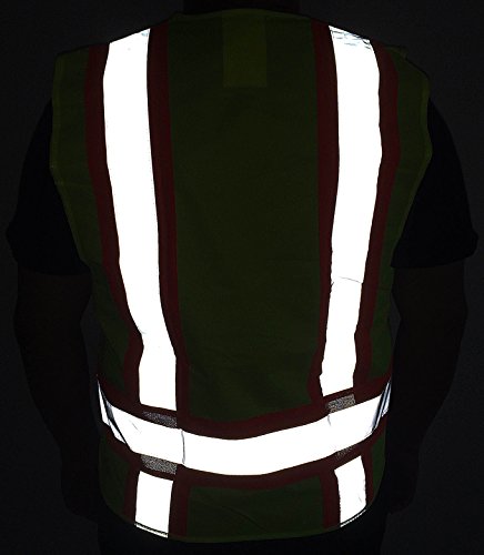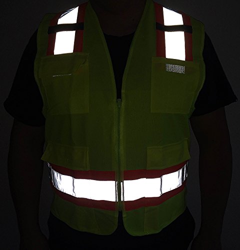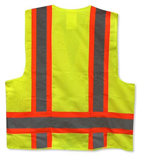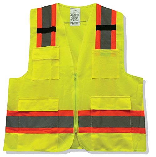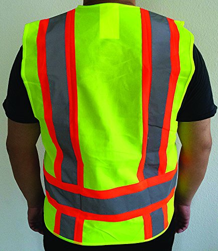 Safety reflective vest deluxe version with 4 pockets L/XL - Meets ANSI 107-2004 Class 2 level. Adult size: L/XL. 3 large pockets all with flaps + 1 pocket used as pen holders on the left chest - 3 slots. Two black woven strips to hook glove or hang a Walkie talkie. Yellow with Neon orange & Hi-Vi reflective strip. 9.5 oz.Feature