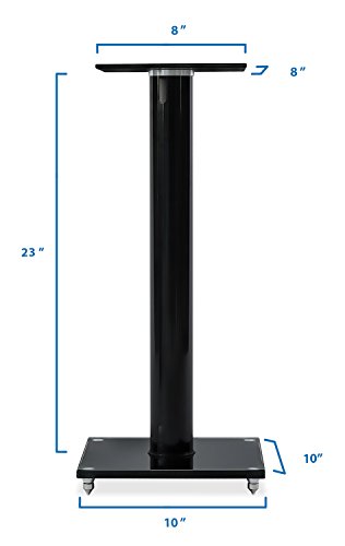The stand height is 23 inches and can carry 22 lbs of load. Glass base and top shelf are supported by one solid heavy-gauge Aluminum pillar. Top plate measures 8 inch by 8 inch. The bottom plate measures 10 inch by 10 inch. Helps place your speakers at optimal height for stereo or surround sound.