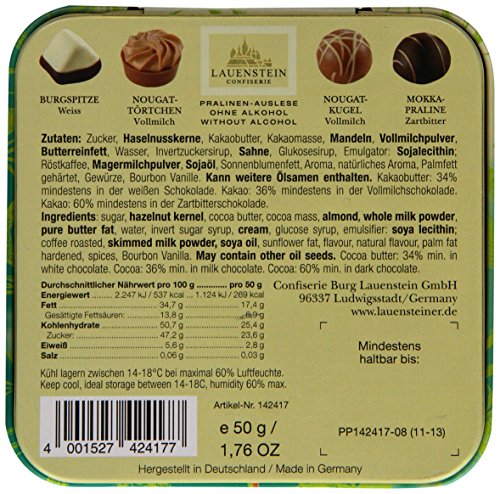 -. Feature : chocowords herzlichst / Wunderschön gestaltete Lauensteiner Geschenkdose, die viel zu sagen hat - mit hochgeprägtem Schriftzug. Diese nostalgische Metall-Dose lässt das Lauenstein-Credo "Ein kleines Stück vom Glück" Wirklichkeit werden. / Inhalt 50g- ohne Alkohol, 4fach sortiert
