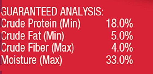 Guaranteed AnalysisCrude Protein (Min)...18.0%, Crude Fat (Min)... 5.0%, Crude Fiber (Max)...4.0%, Moisture (Max)...33.0%.
