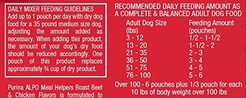 DirectionsDaily mixer feeding guidelines. Add up to 1 pouch per day with dry dog food for a 35 pound medium size dog, adjusting the amount added as necessary. When adding this product, the amount of your dog's dry food should be reduced accordingly. One pouch of this product replaces approximately 3/4 cup of dry product. When switching to ALPO, offer increasing amounts of the new food with decreasing amounts of the old food. This gradual transition will help avoid dietary upsets. Provide adequate fresh water in a clean container daily. For your pet's health, see your veterinarian regularly. Amounts are recommended for an average adult dog with normal activity. Remember food intake requirements vary depending on age. activity and environment, and should be adjusted accordingly. Store in a cool, dry place.