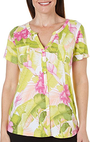 Printed tropical floral print super soft short sleeve v neck button up tee shirt
