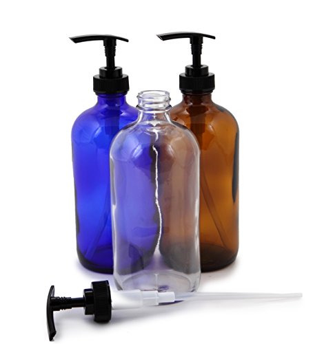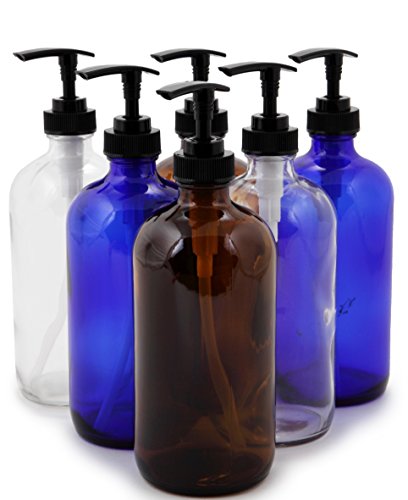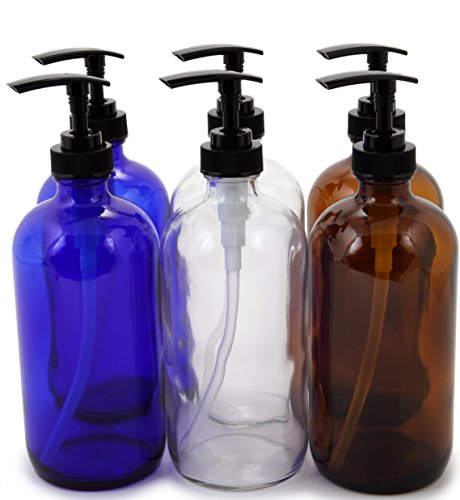 - 6 - 16 oz, Assorted Colors (Clear, Amber, Cobalt Blue) glass bottle's, with Black Lotion Pumps.