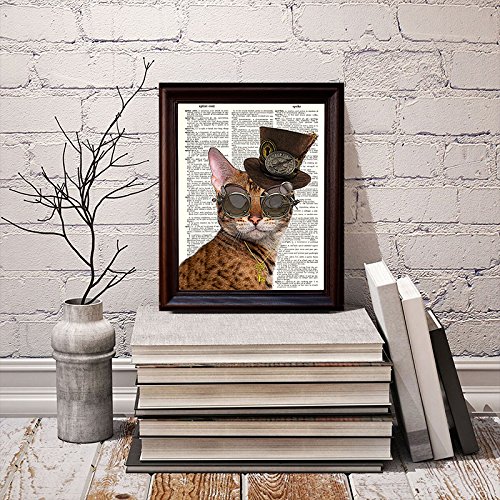 This Steampunk "Clockwork" kitty design is printed on beautiful vintage dictionary paper. These prints are definitely a conversation starter and look fabulous as a wall hanging. Each design is carefully selected and then printed on vintage dictionary paper giving it that beautiful golden color that only comes from age. Since we use real book pages some unevenness or spotting occurs, this only adds another layer to the print, making each one truly unique. Dimensions are approximately 8" W x 10.5" L. *** Frames are not included.***Feature