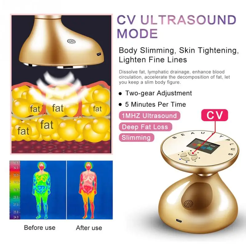 CV ULTRASOUND MODE: The 1 MHz ultrasound therapy which is often used by professional slimming machines. High frequency vibration caused by ultrasound therapy can remove cellulite deep under skin, reduce stubborn fat, achieve the slimming and body shaping effect.