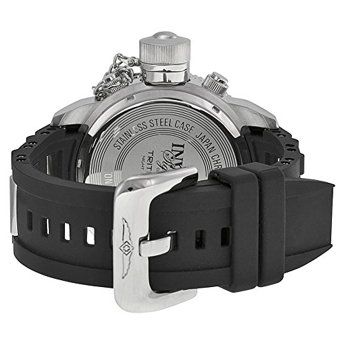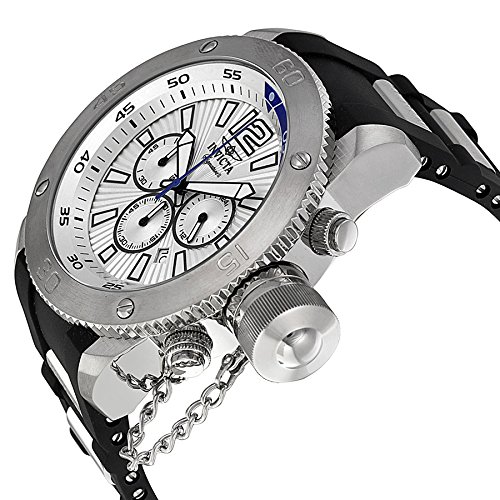 Stainless steel case with a black rubber strap with stainless steel center links. Uni-directional rotating stainless steel bezel. Silver dial with luminous hands and index hour markers. An Arabic numeral marks the 12 o'clock position. Minute markers around the outer rim. Dial Type: Analog. Luminescent hands and markers. Date display between 4 and 5 o'clock positions. Chronograph - three sub-dials displaying: 60 second, 60 minute and 24 hour. Quartz movement. Scratch resistant flame fusion crystal. Push / pull crown with screw down canteen cover. Solid case back. Case diameter: 52 mm. Case thickness: 17.7 mm. Round case shape. Band width: 25 mm. Tang clasp. Water resistant at 50 meters / 165 feet. Functions: chronograph, date, hour, minute, second. Casual watch style. Invicta Signature II Russian Diver Silver Dial Chronograph Mens Watch 7421.