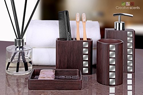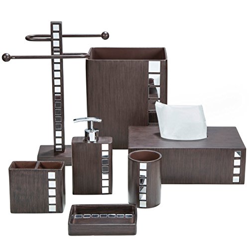 - Feature : QUALITY RESIN BATH ACCESSORY; the Marquee 4-Piece Bath Accessory Set is made of durable resin that can easily last a lifetime! Soap remnants don't adhere to the surface of the resin, meaning that you can easily clean up every piece in the set. / COMPLETE LUXURY SET; your bathroom deserves the best. Our set consists of 1 lotion/soap dispenser (6.5 x 3.5 x 1.75), 1 toothbrush holder (3.75 x 4.5 x 2), 1 soap dish (1 x 5.25 x 3.75), and a tumbler (4.25 x 2.75 x 2.75) providing everything you'll ever need to keep your bathroom fully functional. / BATHROOM ACCESSORIES WITH GORGEOUS LOOK; our bath accessories have a stylish, streamlined appearance that mimics wood, along with small square mirrors that beautifully accent them. Dazzlingly complement your modern bathroom decor with the Marquee set! / METAL PUMP; the soap/lotion dispenser in our set is geared up with a stylish metal pump that makes a bold statement in contrast with the brown recipient. It's functional, easy to use, and guaranteed to add a sense of luxury to your bathroom! / STRONG ON DETAIL; the Marquee 4-Piece Bath Accessory Set is stunningly minimalistic yet strong on detail, sporting clean lines and combining form with function to suit every homeowner's taste! Backed by a LIFETIME GUARANTEE, this is totally risk-free buy; so buy with confidence. CLICK the Orange button to Order Now!