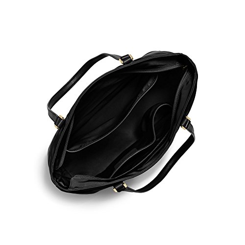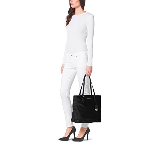 -. Brand : -. Color : black -. Department : womens -. Feature : Nylon; Double handles with 10" drop / Top zip closure; Exterior features silver- or gold-tone hardware and 1 slip pocket / Interior features 1 zip pocket, 2 slip pockets and 1 padded pocket for a tablet / 15" W x 13" H x 6" D;Silhouette is based off 5'9" model / Imported -. ProductGroup : Shoes -. ProductTypeName : HANDBAG -. Title : MICHAEL Morgan Large Tote