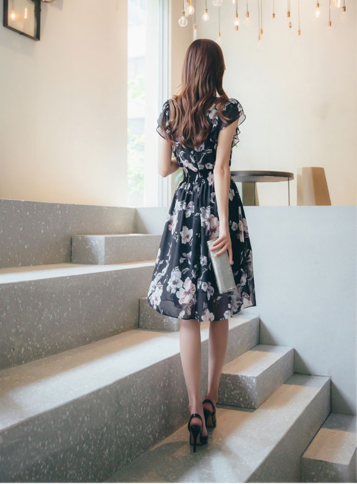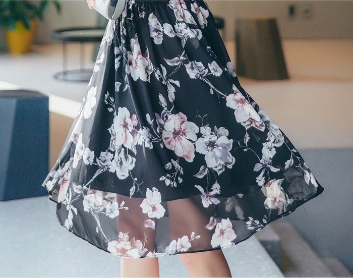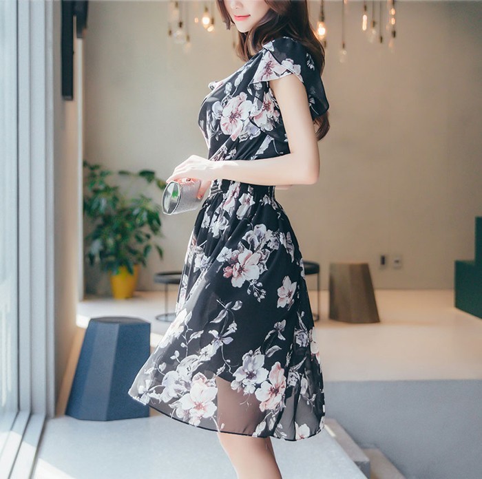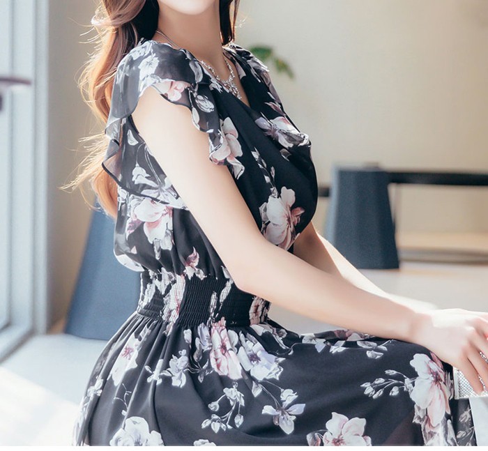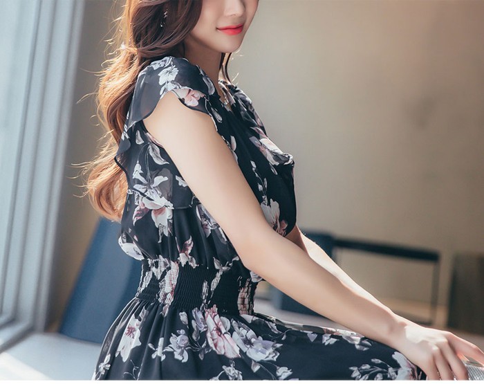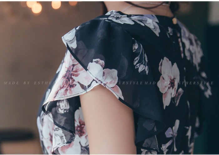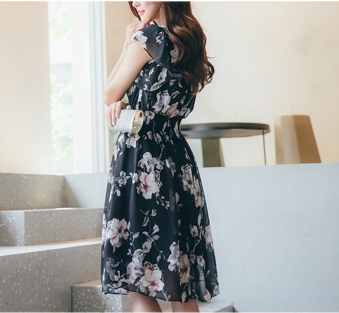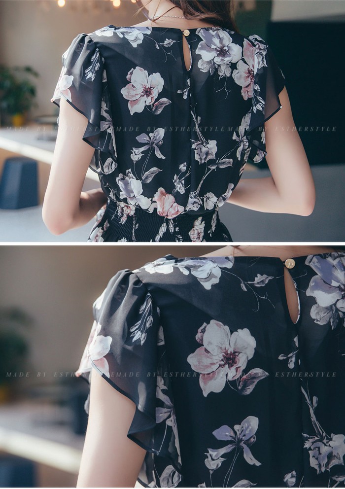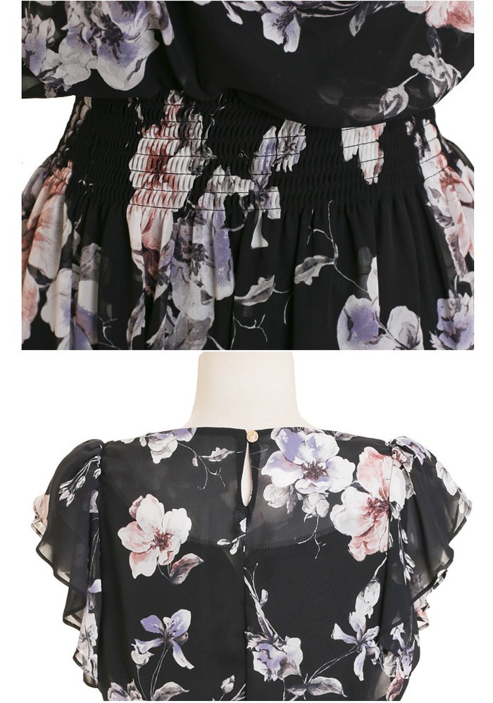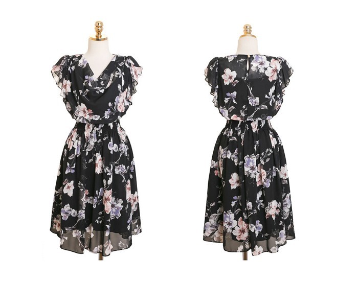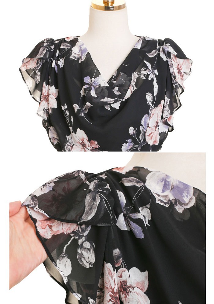 商品名:ワンピース 膝丈 シフォン 半袖 花柄 フラワー ボタニカル柄