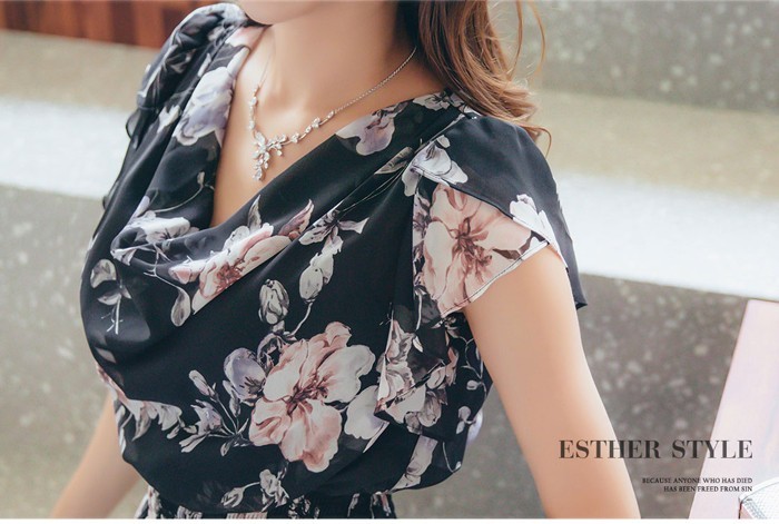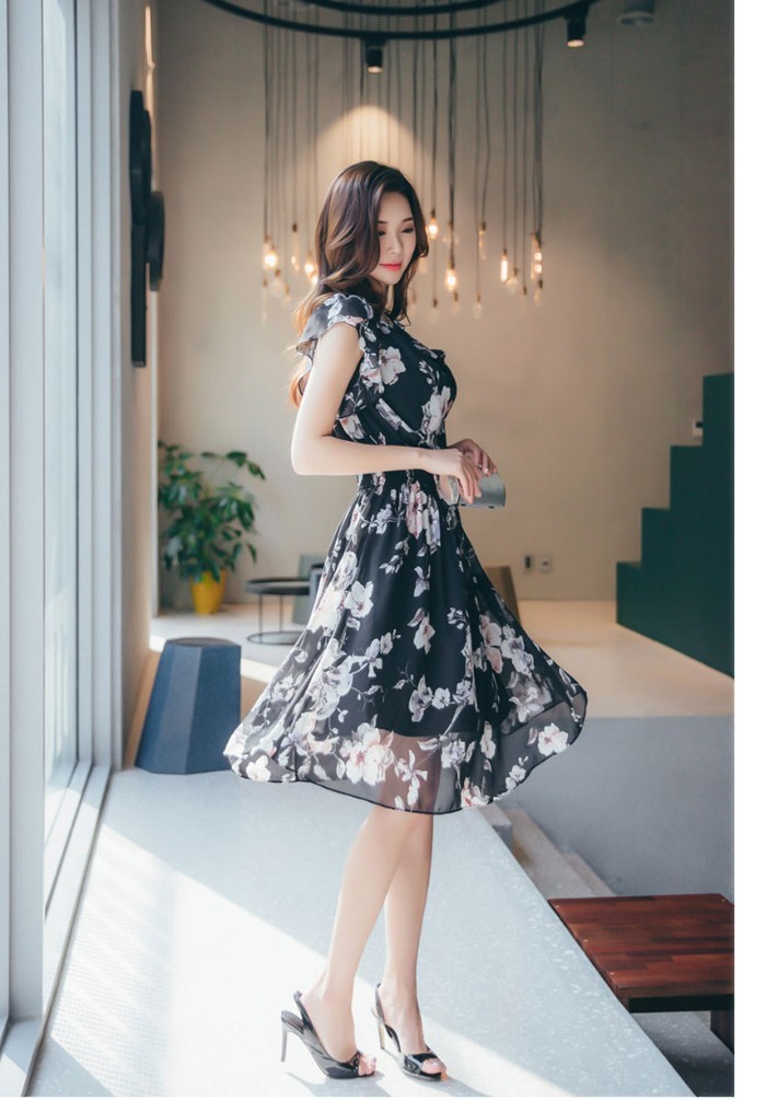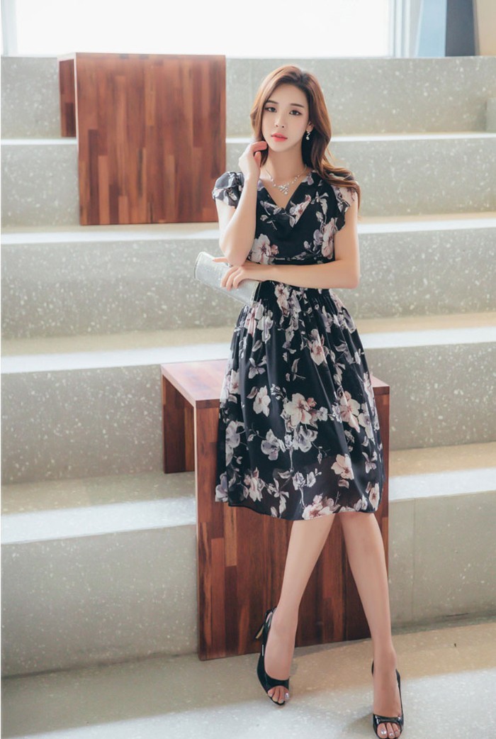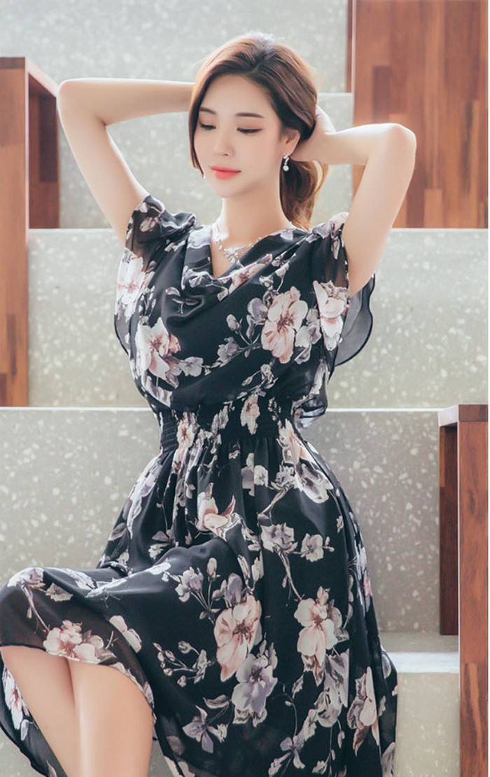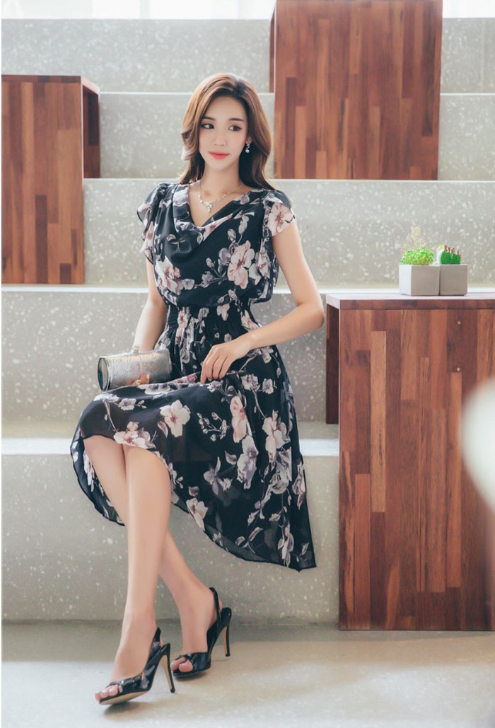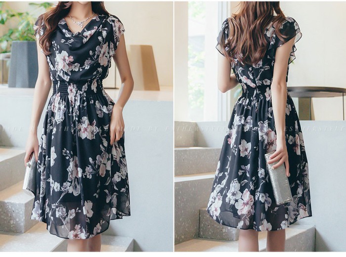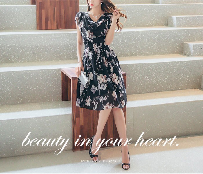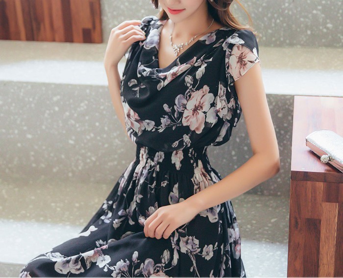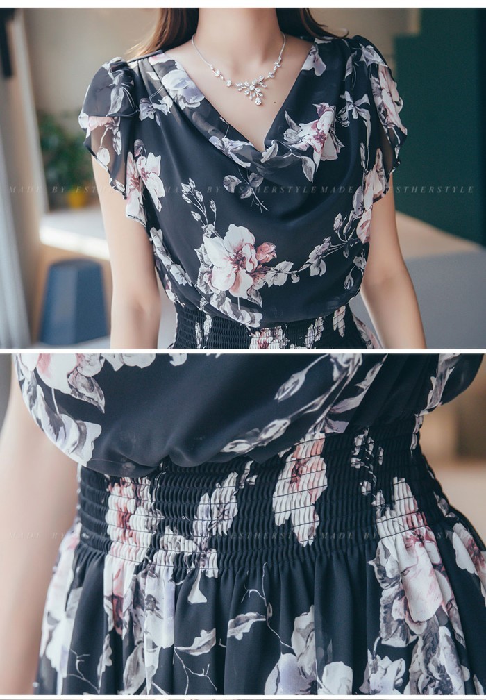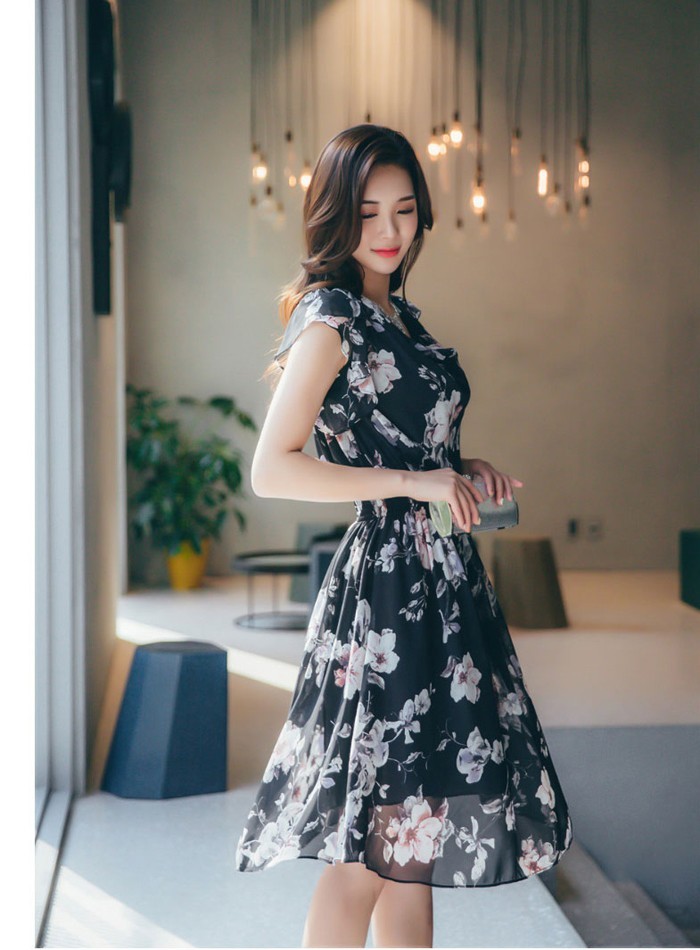 商品名:ワンピース 膝丈 シフォン 半袖 花柄 フラワー ボタニカル柄