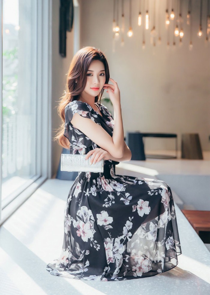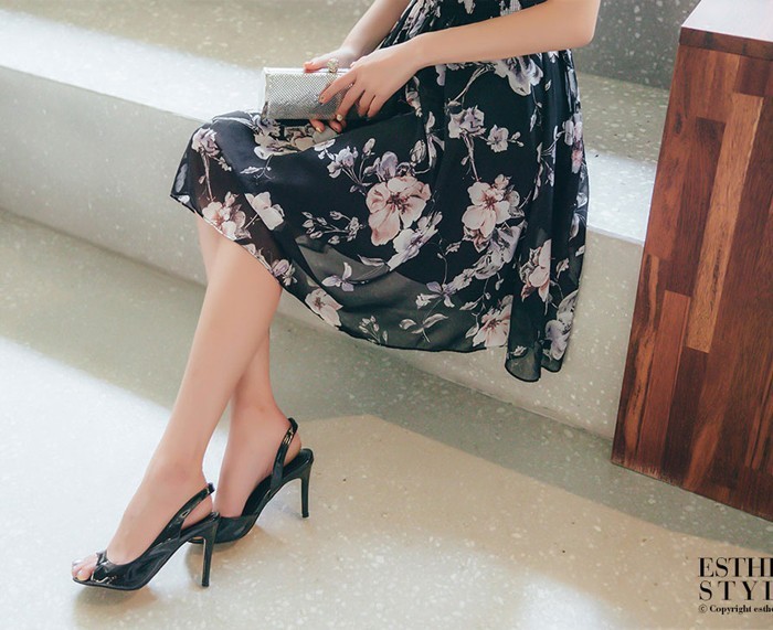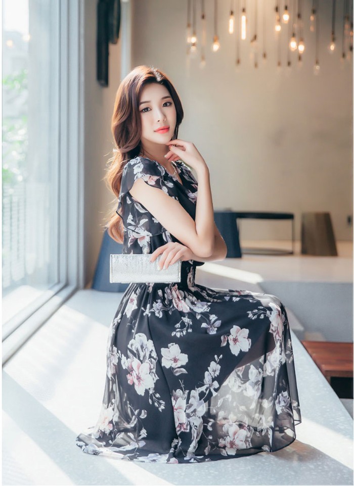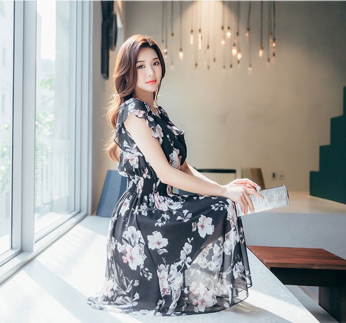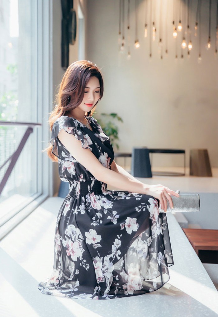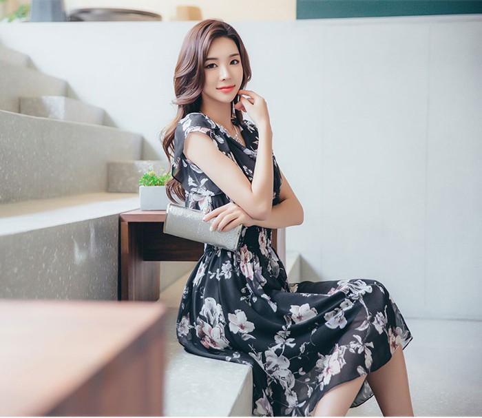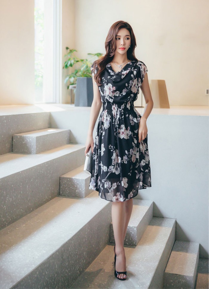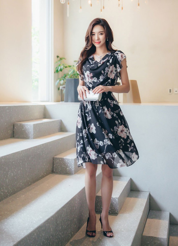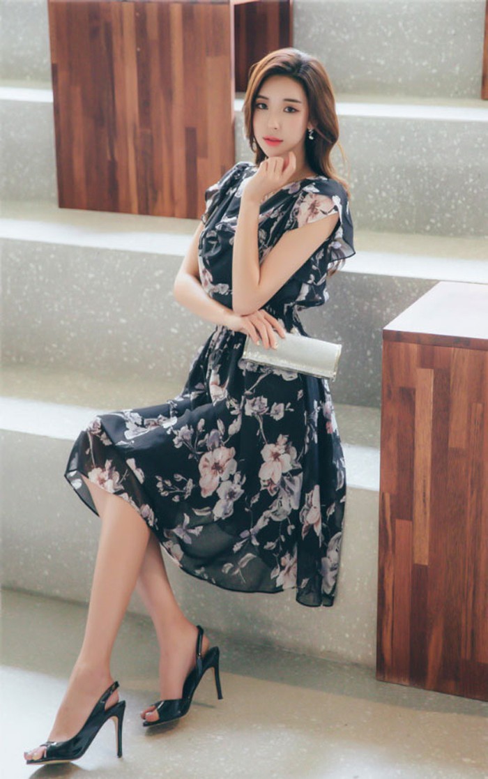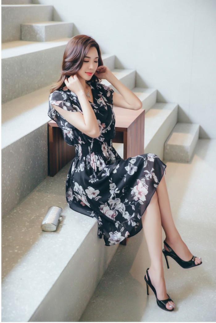 商品名:ワンピース 膝丈 シフォン 半袖 花柄 フラワー ボタニカル柄