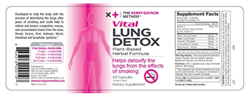 -. Binding : Health and Beauty -. Brand : KerryGaynorMethod.com -. EAN : 0661799031844 -. Feature : Powerful way to detoxify lungs from years of smoking* / Taken additionally with the proven Kerry Gaynor Method for quitting smoking (85% success rate) or separately / Formula developed to relieve and loosen accumulated toxins from problem affected areas such as nose, throat, liver, kidneys and lymphatic systems for starters* / For best results, take for a certain amount of time based on number of years smoked / These pills are manufactured in a NPA-GMP compliant facility. -. IsAdultProduct : 0 -. Label : KerryGaynorMethod.com -. LegalDisclaimer : Only for use by adults, not for those under the age of 18. -. Manufacturer : KerryGaynorMethod.com -. MPN : VLD1 -. PartNumber : VLD1 -. ProductGroup : Health and Beauty -. ProductTypeName : HEALTH_PERSONAL_CARE -. Publisher : KerryGaynorMethod.com -. Studio : KerryGaynorMethod.com -. Title : The Kerry Gaynor Method Vital Lung Detox - Plant-based Herbal Formula to Cleanse Body From Harmful Effects of Years of Smoking - 60 Capsules/bottle - 1-month Supply -. UPC : 661799031844