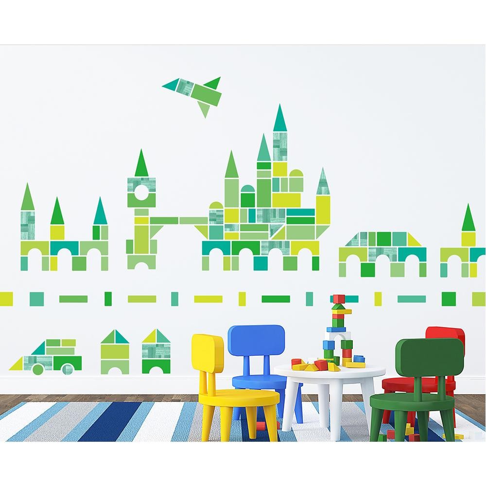 | さまざまな色の積み木で作られた街並みがとても楽しいウォールステッカーです。お誕生日や記念の日に、はじめての子供部屋に、いろいろなシーンでお使いいただけます。 |