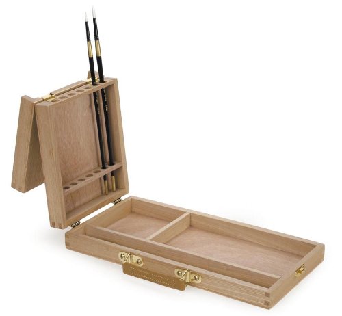 Handy, portable long handled wood brush box keeps both brushes and paints safe and organized. Hinged lid acts as a brush holder when box is open. Finished, smooth wood surface, brass hinges and hardware. Box is light weight and easy to carry with leather look carrying handle. Brushes not included. Measures 13-1/4-Inch by 6-1/2-Inch by 2-Inch (33.65 centimeters by 16-1/21 centimeters by 5.08centimeters).Feature
