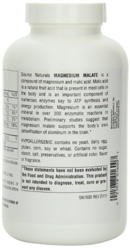 Source Naturals Magnesium Malate is a compound of magnesium and malic acid. It supports proper muscle function, cardiovascular health, and energy production. Malic acid is a natural fruit acid that is present in most cells in the body and is an intermediate in the Krebs cycle, where energy is captured during the metabolism of carbs and fats. Magnesium is an essential cofactor for over 300 enzymatic reactions in metabolism, ATP synthesis and energy production. Magnesium plays important roles in muscle relaxation, because of its function as a cofactor for enzymes and because of its ability to counterbalance calcium in the cell.Feature