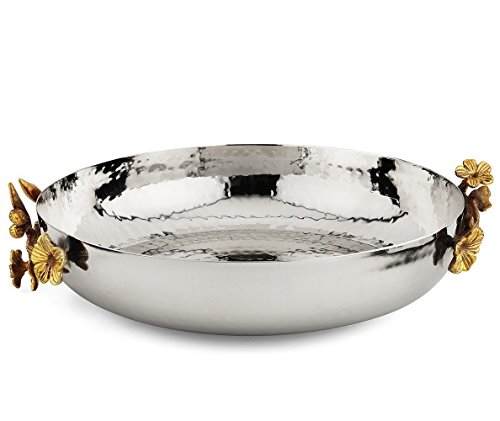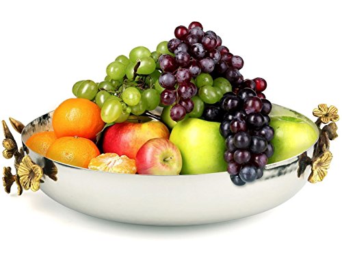Salad, Fruit, Vegetable & Bread Storage Decorative Coffee & Kitchen Table Bowl By Holiday Grabs– Two Toned Glistening Steel Body & Side Brass Embellishments– Hand Hammered, Leaves & Flowers Design