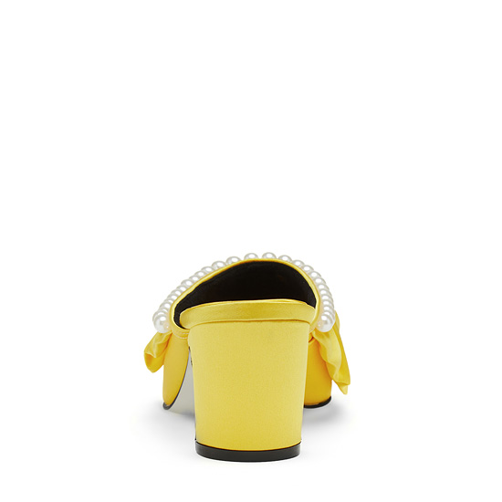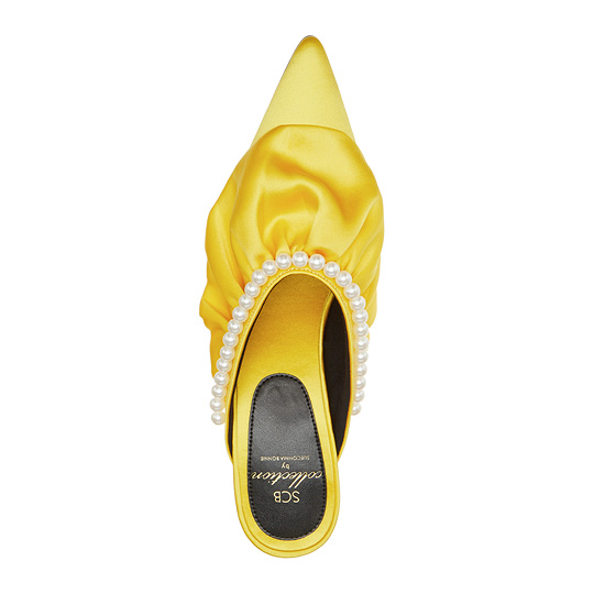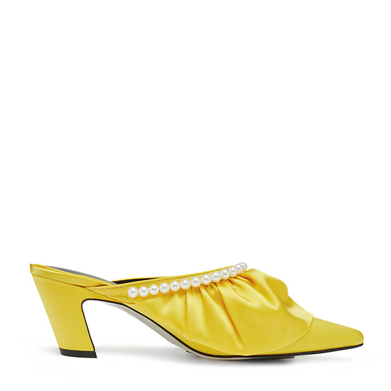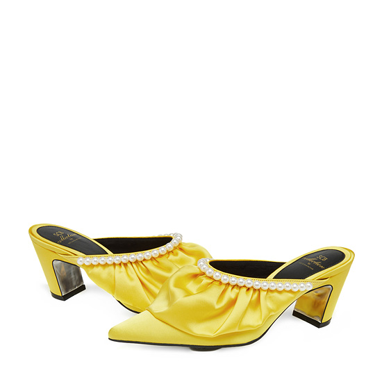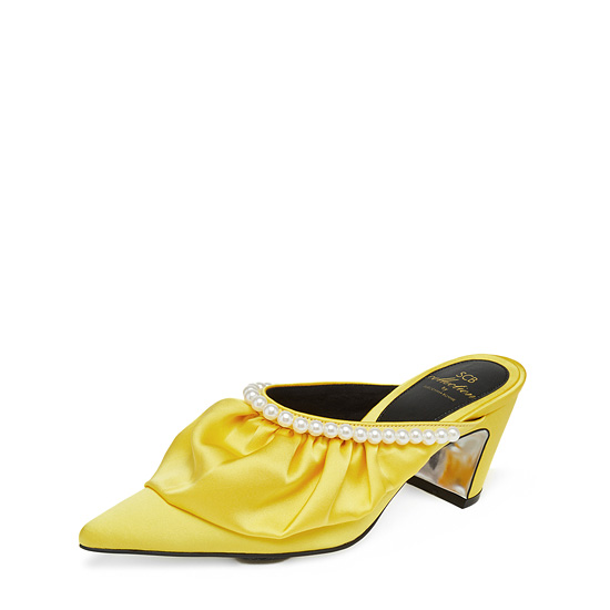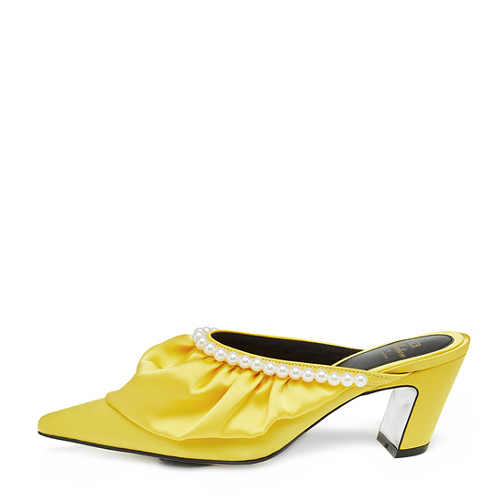 - 볼륨감있는 러플과 진주장식을 사용한 페미닌한 뮬.