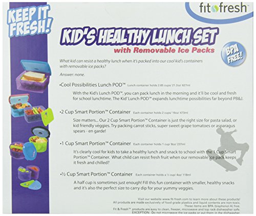 The 17 piece Kids Lunch Container Value Set is great for multiple kids on the go or for having the right assortment of containers on hand. Choose the cup, 1 cup, 2 cup or Lunch Pod to keep your child's lunch fresh with a removable ice pack that snaps right into the lid. The set includes two cup containers, two 1 cup containers, two 2 cup containers, one lunch pod container, lids for all containers, one 1 cup ice pack, one 2 cup ice pack and one ice pack for the lunch pod container. Give kids the energy they need to ace that spelling test starting with F-R-E-S-H!