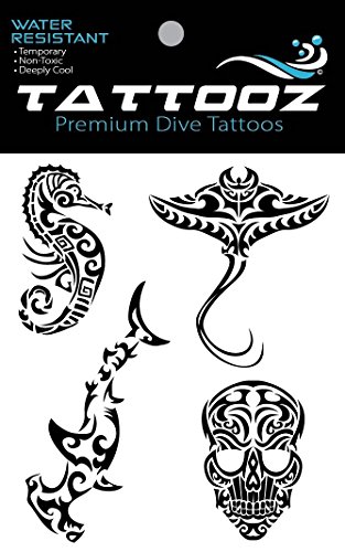 Premium Temporary Dive Tattoos. Pack includes Seahorse, Sting Ray, Hammerhead Shark and Skull.