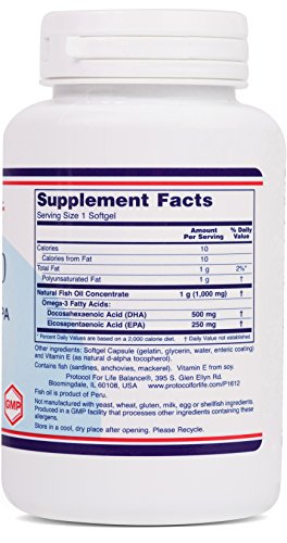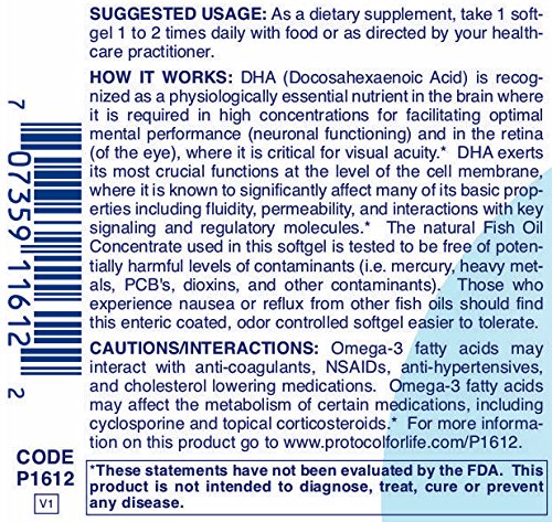 HOW IT WORKS: DHA (Docosahexaenoic Acid) is recognized as a physiologically essential nutrient in the brain where it is required in high concentrations for facilitating optimal mental performance (neuronal functioning) and in the retina (of the eye), where it is critical for visual acuity.* DHA exerts its most crucial functions at the level of the cell membrane, where it is known to significantly affect many of its basic properties including fluidity, permeability, and interactions with key signaling and regulatory molecules.* The natural Fish Oil Concentrate used in this softgel is tested to be free of potentially harmful levels of contaminants (i.e. mercury, heavy metals, PCB's, dioxins, and other contaminants). Those who experience nausea or reflux from other fish oils should find this enteric coated, odor controlled softgel easier to tolerate.Protocol For Life Balance® is an A-rated GMP manufacturer of pharmaceutical grade dietary supplements created for healthcare practitioners. Our product line is comprised of effective, science-based formulations intended to address common nutrient deficiencies and support healthy physiological function. These formulations are based on the latest advances in nutritional science and incorporate trademarked ingredients of the highest quality. Our serving sizes are based on doses used in clinical trials and other published data, and the ingredients used in our products have been tested for efficacy in clinical trials and laboratory studies.