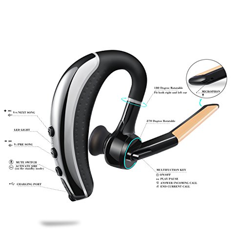 -. Feature : Light Weight and Ergonomic Design:lightweight and will not pressure on your head, and offers you an ultra comfortable experience for extended periods of time wearing.180 degrees flip-boom arm allows to adjust the angle and fit the headset in both right and left ear. / High Voice Quality:Crystal clear voice based on DSP digital noise cancelling tech. Stable Bluetooth signal, you can have a clear wireless conversation with your friends. REAL HANDS-FREE With Mute Switch, Microphone muting function provides a safe and comfortable conversation experience. / Smart Function:Our Bluetooth Headset with mic supports SIRI voice prompt and mute switch, one key to Power on and enter pairing mode,1 to 2 connection. 5-7 hours working time, 1.5 hours quick charge. / Superior Performance and Easy to use:Supports Multipoint Technology,the wireless headset that work with all smartphone, tablets and music players. Support Stream Music/Video/Audio. / ONE YEAR GUARANTEE PERIOD:For this wireless earpiece We provide 30 days no reason to return, worry-free 12-month guarantee period and friendly customer service.