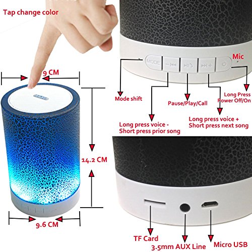 -. Feature : LED Colorful Light: Gently tapping the top of speaker, can control the color changing and the switch of lights, which has about 10 modes and will dancing with the music(The sound need to be 40% above the whole sound volume) / Charging method: you can use USB the cable in package to charge it through phone adapter, computer USB port, power bank. / Connect ways: You can connect it through the bluetooth from 10m away with you phone, ipad,setc.. If your device do not have a bluetooth, you can connect it throuth the 3.5mm AUX line,so it can be connected your computers and tablets through the AUX line / Compatible device: work with Iphone 5 5C 5S 6 6S 7 7S Plus, Samsung Galaxy S3 S4 S5 S6 S7 Edge + Plus Note 2 3 4 5 6 7 j2, LG G4 stylo Optimus, Nexus 5 6 6p, Sony z5, HTC One, Nokia Lumia 520 / 920 / 1020 / 1520 / Incredible Direct Reading Mode : it could automatically play the music with a stand alone Micro SD card. (the Micro SD card does not include in the package)