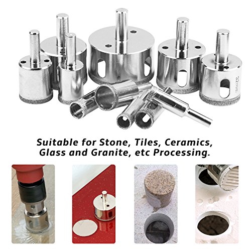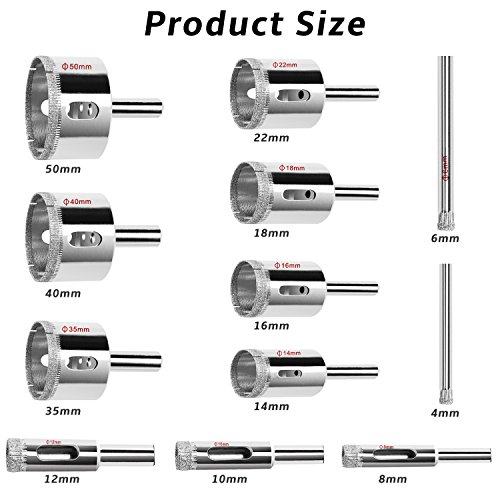 - √ Meet All You Need. Package includes 12 Sizes diamond drill bits: 4mm, 6mm, 8mm, 10mm, 12mm, 14mm, 16mm, 18mm, 22mm, 35mm, 40mm, 50mm. Also come with a portable carrying case.