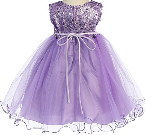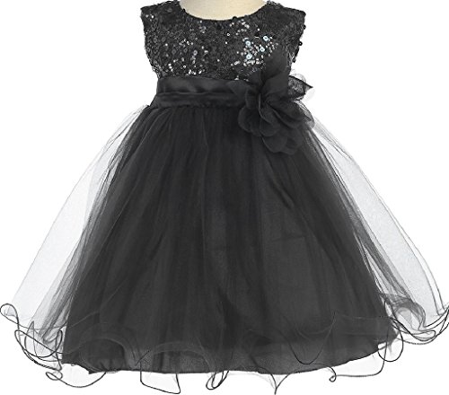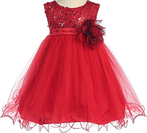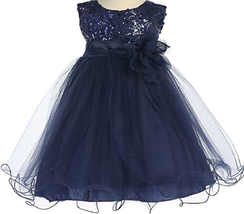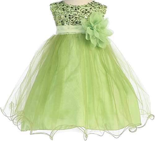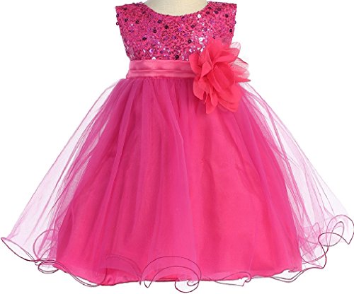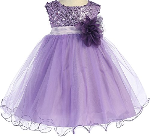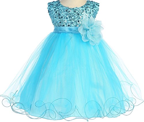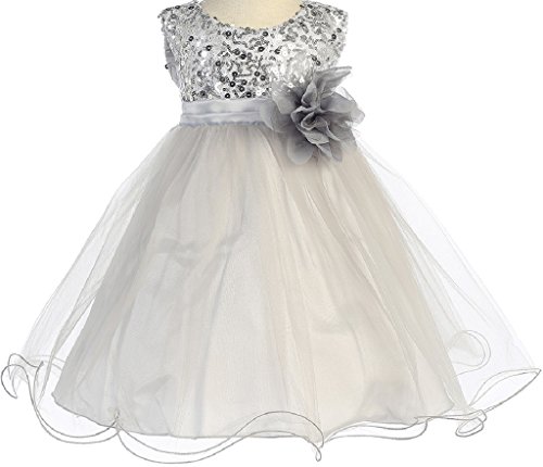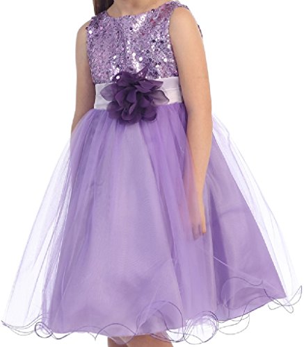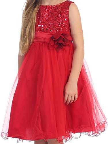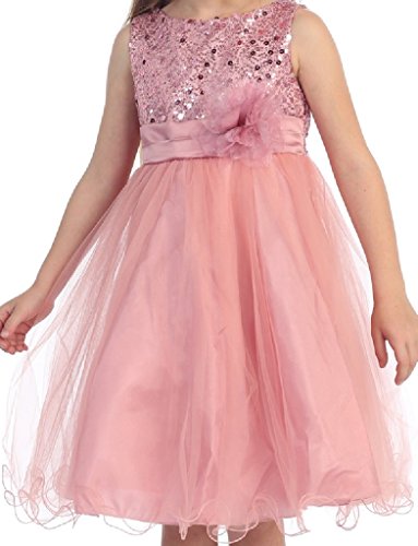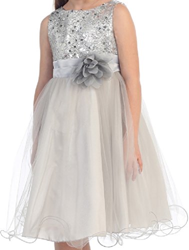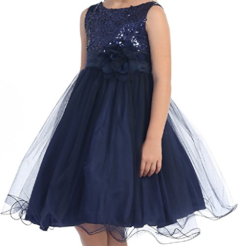 This gorgeous fancy dress has rounded boat neck paillette sequined bodice with tulle overlaid skirt. Comes with flower detail on side of the satin waistband. Great for Flower girl dress, Holiday party, Pageant and other special occasion.Feature