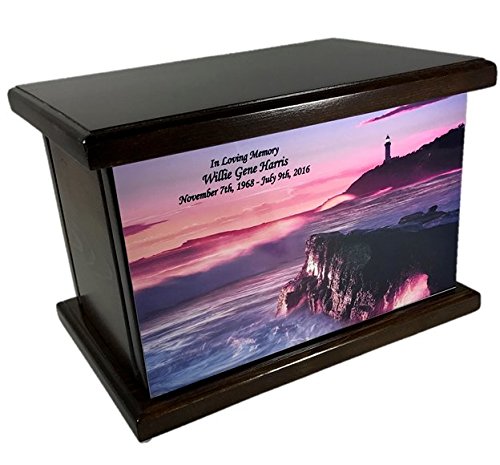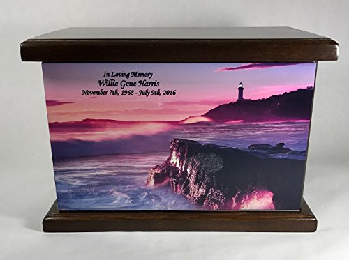 Cremation Urn, Wood funeral Urn, Lighthouse Ocean Sunset Wooden Urn with custom personalization