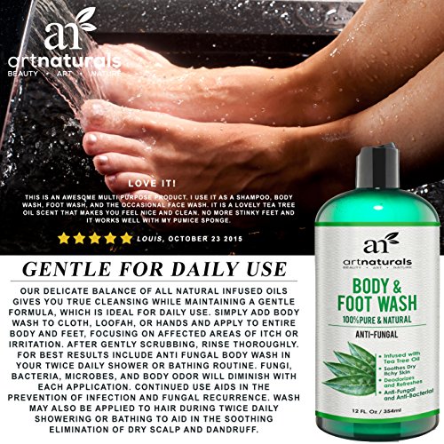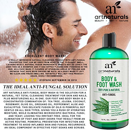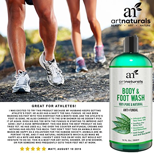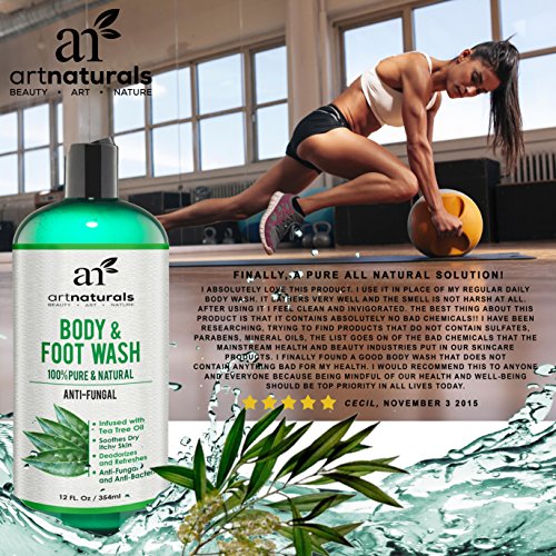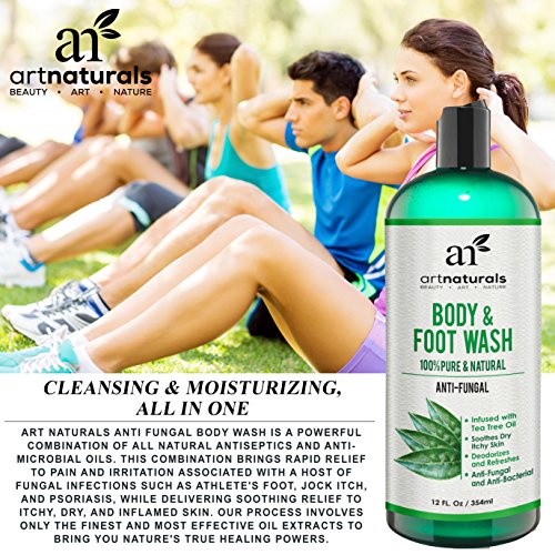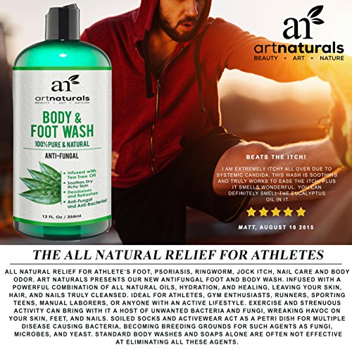 ALL NATURAL RELIEF FOR ATHLETES FOOT, PSORIASIS, RINGWORM, JOCK ITCH, NAIL CARE & BODY ODOR. ArtNaturals presents our new antifungal foot and body wash. Infused with a powerful combination of all natural oils, hydration, and healing, leaving your skin, hair, and nails, truly cleansed, fresh, and filled with natural aroma. Ideal for athletes, gym enthusiasts, runners, sporting teens, manual laborers, or anyone with an active lifestyle. Exercise and strenuous activity can bring with it a host of unwanted bacteria and fungi, wreaking havoc on your skin, feet, and nails. Soiled socks and activewear act as a petri dish for multiple disease causing bacteria, becoming breeding grounds for such agents as fungi, microbes, and yeast. Standard body washes and soaps alone are often not effective at eliminating all these agents. Artnaturals Anti Fungal Body Wash is the solution for a natural, yet total cleansing treatment for skin and nails, plus moisturizing all in one. Our foot and body wash is a concentrated combination of: Tea Tree, Jojoba, Coconut, Rosemary, Olive Oil, Oregano Oil, Peppermint, Aloe and Eucalyptus. This delicate fusion of oils is powerful but gentle on all skin types giving you a rush of hydrating moisture, while eliminating microscopic bacteria, fungi, and yeast, leaving you irritant free. Ideal for the elimination of foot and body odors that result from an active routine. Powerful prevention for infection and treatment to avoid inflamed skin, and fungal recurrence. An ideal component in effective foot soaks and scrubs. Like all our products our tea tree infused body wash is backed by ArtNaturals 100% money back guarantee so you can buy with the confidence Risk Free.