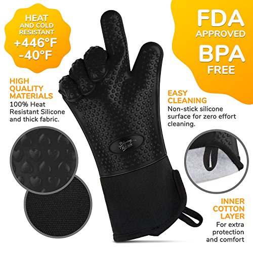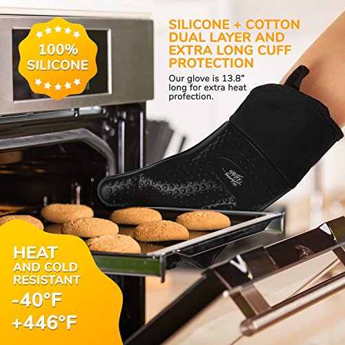 Silicone Oven Gloves - Great Heat Resistant Mitts Extra Long with Internal Cotton Lining for Cooking, Pot Holder, Grilling, BBQ, Baking And Smoking - Black