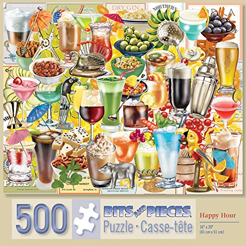 Studio : Melville Direct Publisher : Melville Direct Binding : Toy Product Description Happy Hour is a 500 piece jigsaw puzzle designed by Rosiland Solomon. It measures 16" X 20" when completed. Since the 16th century, jigsaw puzzles have been a favorite pastime for all ages. Now, with technological advances, Bits And Pieces has taken jigsaw puzzles to a new level of superior quality and challenging fun. Every original Bits And Pieces jigsaw puzzle is made with ultra-heavy weight board and cut with quality random puzzle dies with fully interlocking pieces for a secure fit. At Bits And pieces, we believe that every truly exceptional jigsaw puzzle starts with the work of a truly exceptional artist. We understand what it takes to make a great puzzle. The kind that challenges rather than frustrates, where each area has depth and detail that unfold into a larger beauty. Bits and Pieces commissions original artwork by artists from around the world to create imaginative artwork that puzzlers like you are looking for in a wide variety of puzzle sizes and styles for any age or ability. We know every puzzler is different, so every Bits And Pieces original puzzle is manufactured in two different piece counts, ranging from 100 pieces to 2000 pieces. We also have an innovative collection of specialty puzzles including glow-in-the-dark puzzles, glitter effects puzzles, unique shaped puzzles and puzzles with oversized pieces. 0