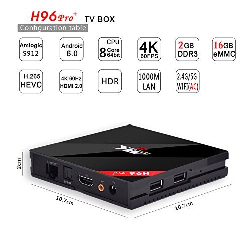 -. Feature : H96 pro+ is the newest version with Amlogic S912 Octa-core 64-bit ARM CortexTM-A53 up to 2GHz, plus 750MHz+ ARM Mali-820MP3 GPU processor. / Powerful Android 6.0 OS, the newest generation of android streaming media player. Users can download, install or uninstall hundreds of free software, games and application programs easily and conveniently. / 2G+16G Storage, support external USB hard drive connection. Bluetooth 4.1 supported, 2.4GHZ/5.8GHZ 802.11a/b/g/n /ac Dual Wifi 1000M ethernet connection supported. / Built-in HDMI 2.0a transmitter including both controller and PHY with HDR, CEC and HDCP 2,2, 4Kx2K@60 max resolution output / H265 and VP9 decoding-- The S912 chipset inside this smart TV Box is a advanced version compared with the previous chipset. It supports both H.265 and VP9 decoding, which are the absolute mainstream decoding formats.