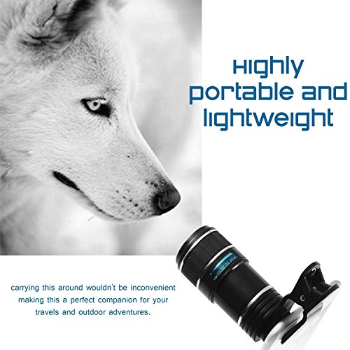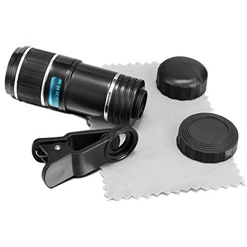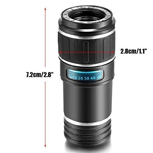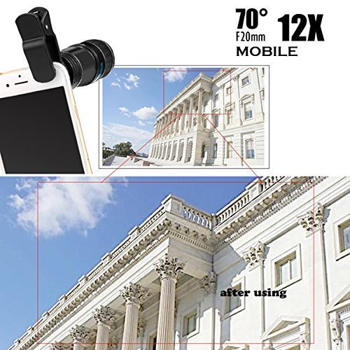 Product Description - Shell Material: Rubber and Plastic - Len: Optical Lens - Color: Black - Compatible with: Universal - Size: 7.2 x 2.8cm/2.8 x 1.1 inch (Diameter x Height) - Magnification: 12X - Viewing angle: 70° - Closest focusing distance: 3m - Item: Phone external camera Special features: - Equipped with a clip to fasten lens and mobile phone - Can not change the phone camera pixels, magnification 12X Using tips: - 1. Connect the lens with the clip - 2. Making sure target the center of camera with the clip - 3. Turning on the camera of the mobile, slightly adjust if the screen not clear - 4. If the scrren not clear, you can manually fine-tune the focus by adjusting the focal ring Package Content: 1 x Mobile Telephoto Lens 1 x Clip 1 x Cleaning Cloth 1 x User Manual 0