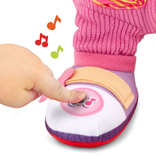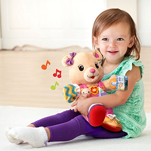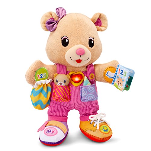 Grow and learn with your new best friend! My Friend AliceTM by VTech® is a cute and friendly interactive plush bear. She is soft and cuddly and features different textures that provide tactile stimulation. Your little one will have fun putting on Alice's mitten, tying her shoelace, buckling her shoe, putting her handkerchief and bear in her pockets and reading her storybook. Press the light-up heart button for playful phrases, feelings and simple questions. Four soft buttons on Alice's hands and feet introduce numbers, a short story, music and sing-along songs, body parts and animals. Bring your new friend with you wherever you go! This interactive plush bear is intended for toddlers ages 6 months to 3 years old; operates on 2 AAA batteries (not included). Product dimensions 13.4" Height, 11.4" Wide, 4.7" DepthFeature