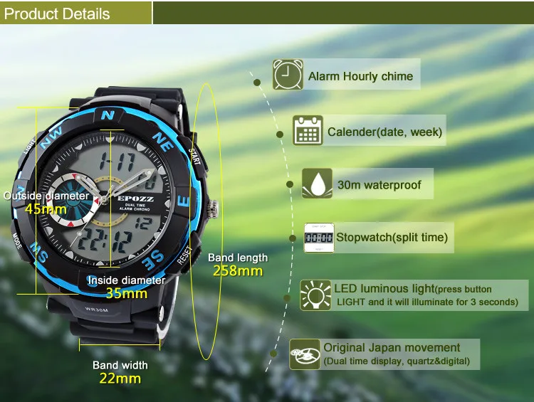 Feature:Water Resistant,Stop Watch,Complete Calendar,Back Light,Alarm