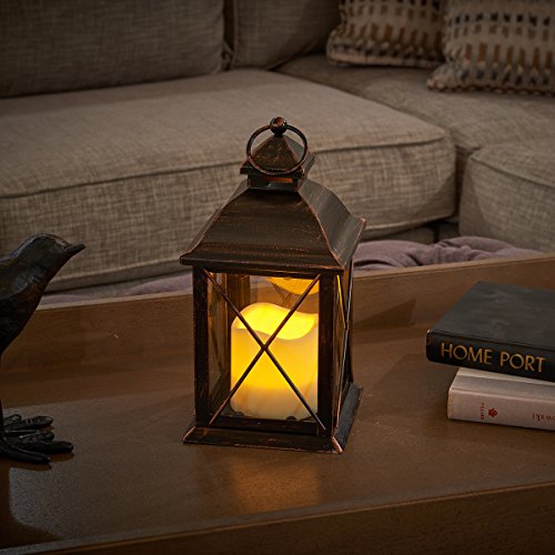 Smart Design STI84035LC Aversa Metal Lantern with LED Candle with Set Timer at Desired Time to Operate Automatically, Includes Realistic Candle Powered by One Amber LED