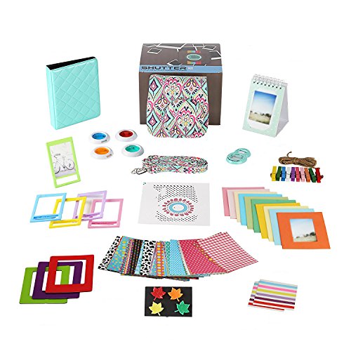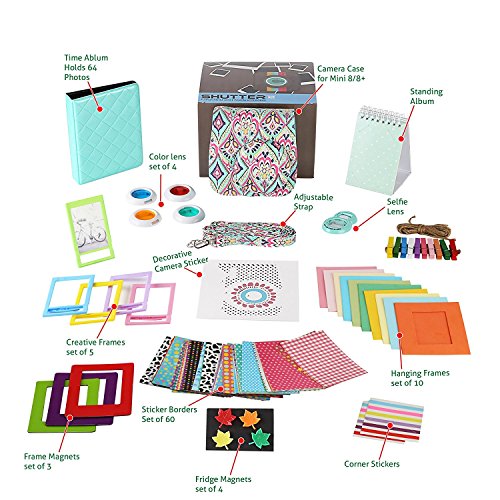 ACCESSORIES: Fujifilm Instax Mini 9 Camera Accessories Bundle contains 14 Piece Gift Kit Set. Includes Camera Case with adjustable strap, Standing Album, Selfie Lens, Holding Hanging Frames Set of 10, Corner Stickers, Fridge Magnets Set of 4, Frame Magnets Set of 3, Creative Frames Set of 5, Color Lens Set of 4, Time Album hold 64 Photos, Decorative Camera Sticker, Border Stickers set of 60 & Adjustable Strap. We have every one of the things you have to get the most out of your camera!